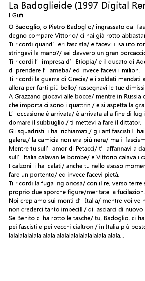 | [00:08] | O Badoglio, o Pietro Badoglio/ ingrassato dal Fascio Littorio,/ col tuo degno compare Vittorio/ ci hai già rotto abbastanza i coglion. |
