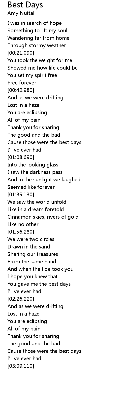 | [00:59.030] | Cause those were the best days |