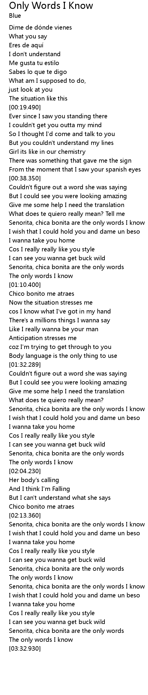 | [01:04.319] | Senorita, chica bonita are the only words |