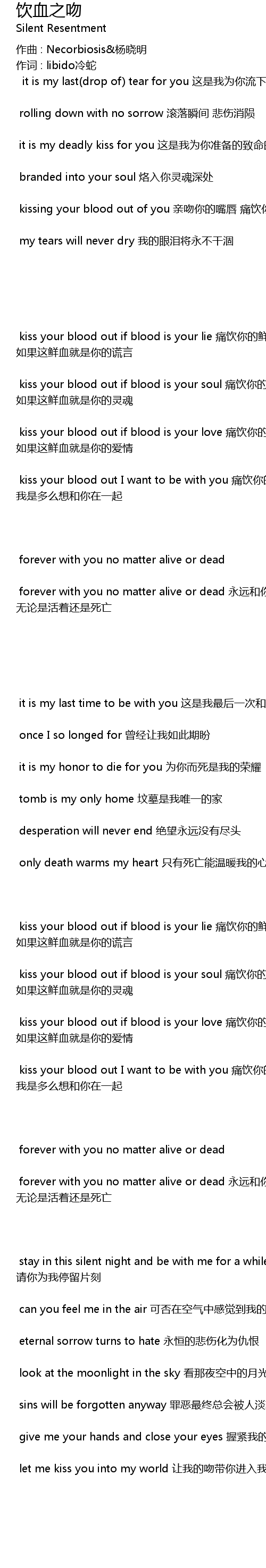 | kissing your blood out of you qīn wěn nǐ de zuǐ chún tòng yǐn nǐ de xiān xuè | |