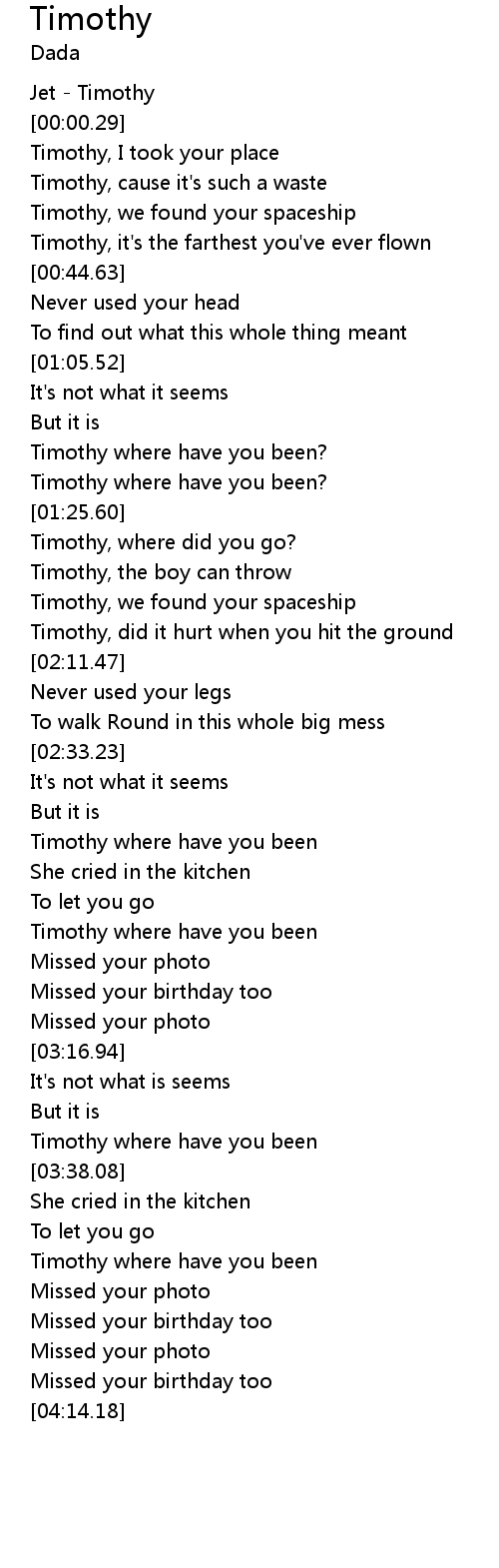 | [02:02.72] | Timothy, did it hurt when you hit the ground |