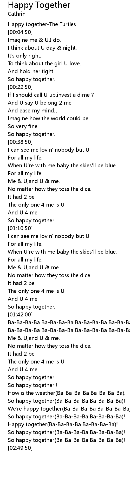 | [02:45.04] | So happy together(Ba-Ba-Ba-Ba Ba-Ba-Ba-Ba)! |