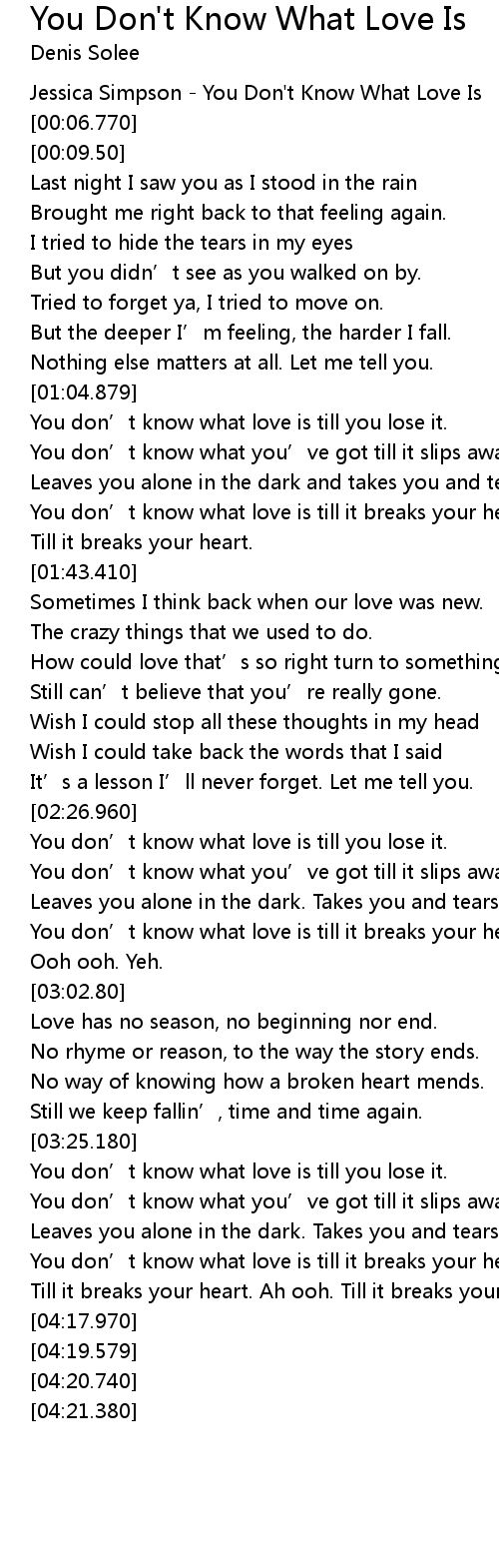 | [00:02.160] | Jessica Simpson - You Don't Know What Love Is |