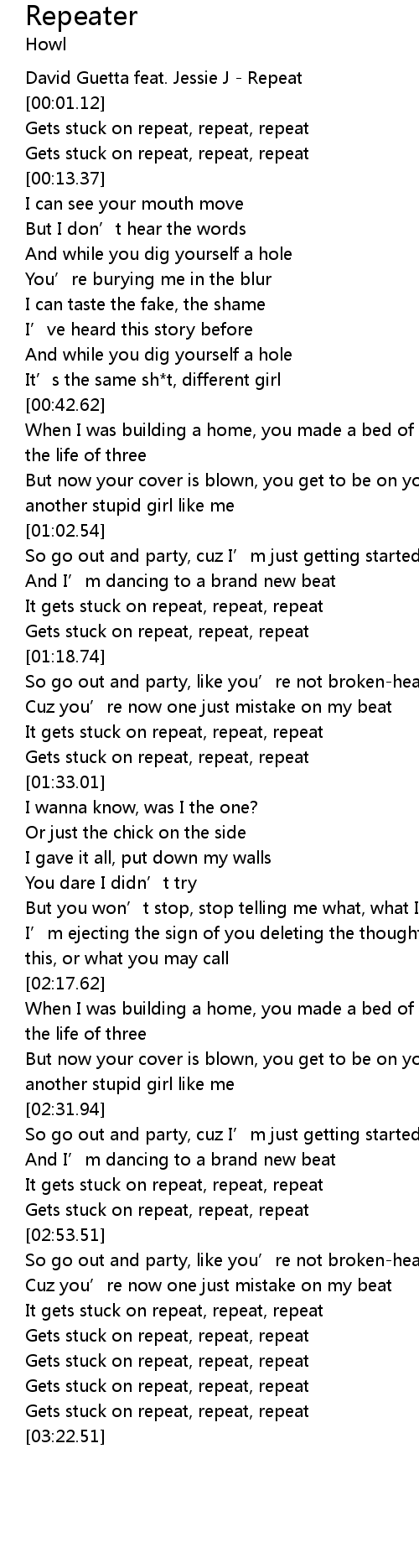| [00:00.00] | David Guetta feat. Jessie J - Repeat |