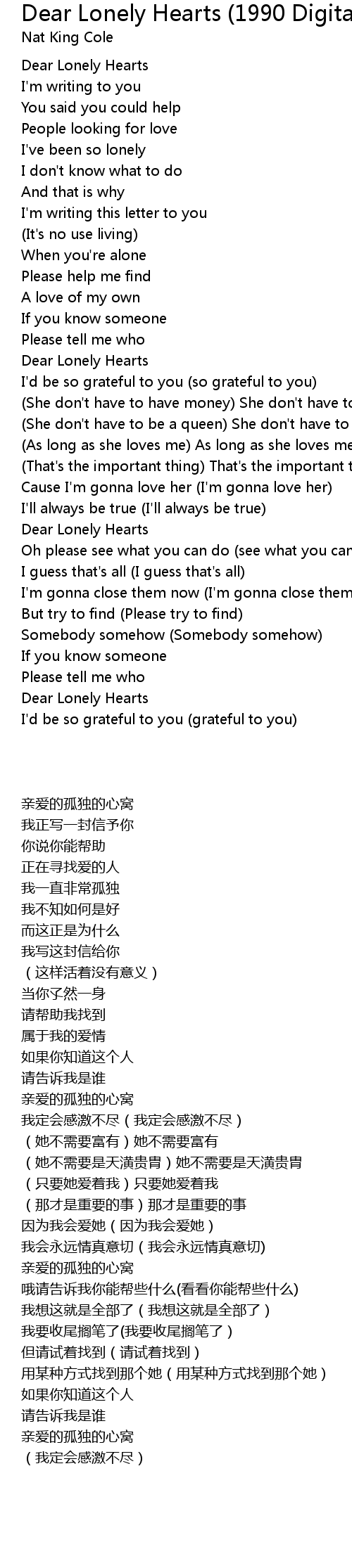Dear Lonely Hearts (1990 Digital Remaster) Lyrics