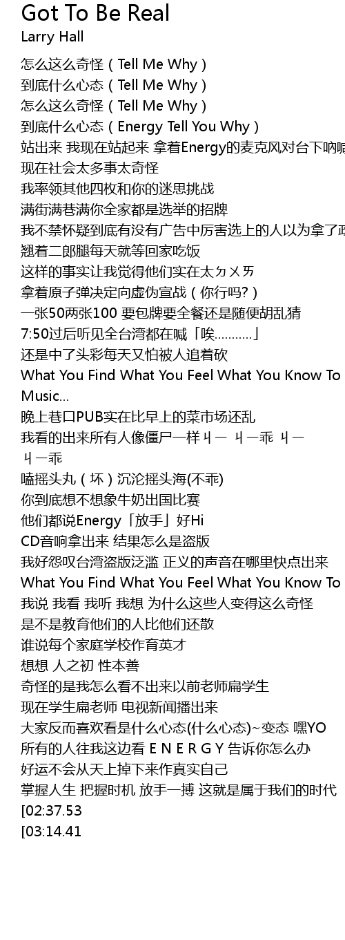 | [03:18.71][03:14.41][03:10.50] | To Be Real |