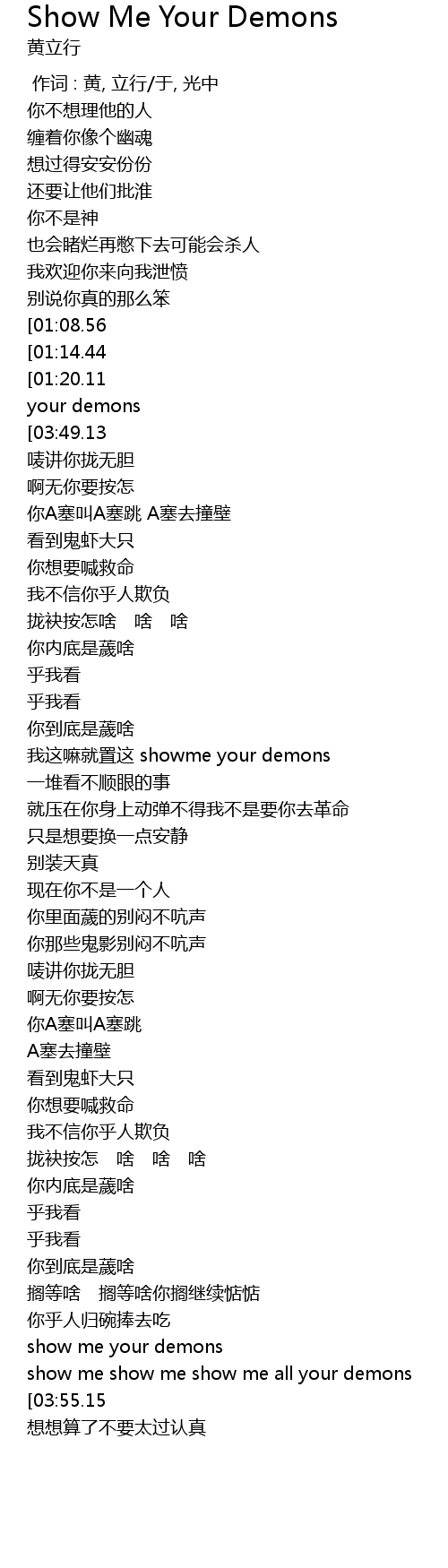 | [03:02.38][01:20.11][03:07.16] | show me your demons come on show me show me all your demons |