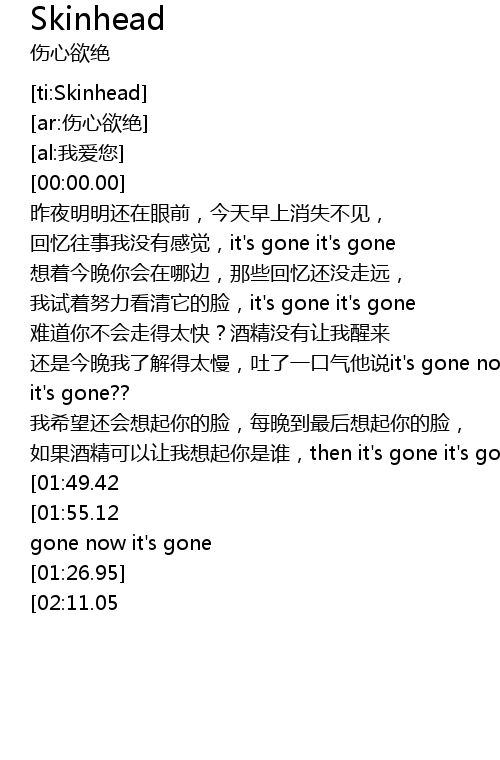 | [00:40.43] | wǒ shì zhe nǔ lì kàn qīng tā de liǎn, it' s gone it' s gone |
