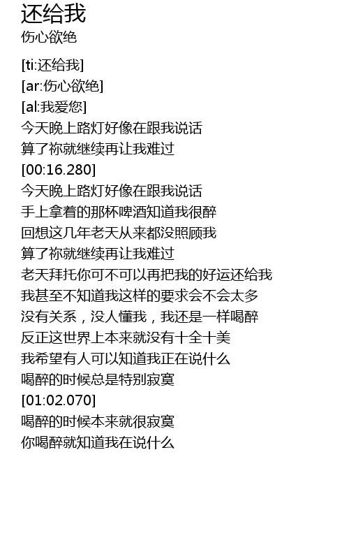 | [00:35.610] | lao tian bai tuo ni ke bu ke yi zai ba wo de hao yun huan gei wo |