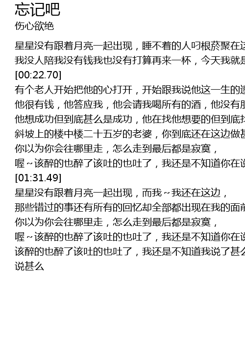 | [02:22.53] | 该醉的也醉了该吐的也吐了,我还是不知道我说了甚么。 |