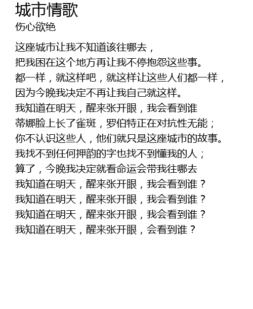 | [01:28.290] | 我找不到任何押韵的字也找不到懂我的人; |