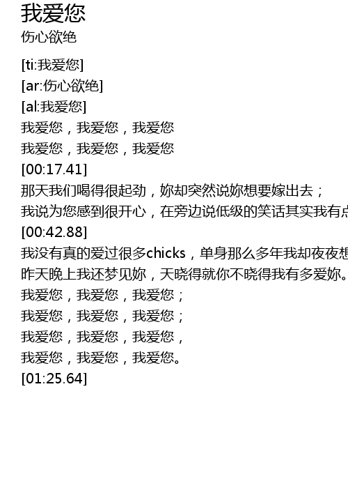 | [00:05.43] | wǒ ài nín, wǒ ài nín, wǒ ài nín |