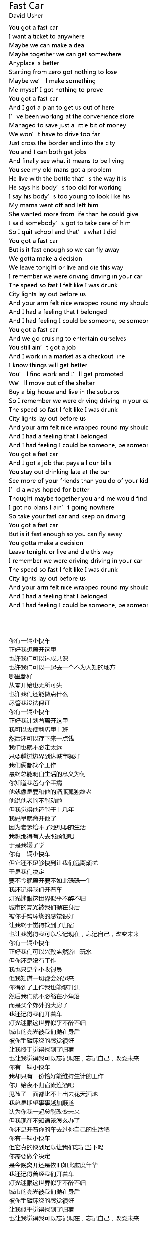 | [00:10] | You got a fast car |