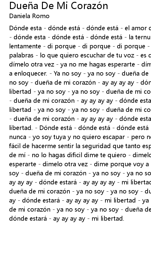 | Dónde esta - dónde está - dónde está - el amor que es como un mar profundo - dónde esta - dónde está - dónde está - la ternura que me inunde lentamente - di porque - di porque - di porque - tienes tanto miedo a las palabras - lo que quiero escuchar de tu voz - es que tu me amas con locura - dímelo otra vez - ya no me hagas esperarte - dímelo otra vez - dime porque voy a enloquecer. - Ya no soy - ya no soy - dueña de mi corazón - ya no soy - ya no soy - dueña de mi corazón - ay ay ay ay - dónde estará - ay ay ay ay - mi libertad - ya no soy - ya no soy - dueña de mi corazón - ya no soy - ya no soy - dueña de mi corazón - ay ay ay ay - dónde estará - ay ay ay ay - mi libertad - ya no soy - ya no soy - dueña de mi corazón - ya no soy - ya no soy - dueña de mi corazón - ay ay ay ay - dónde estará - ay ay ay ay - mi libertad. - Dónde está - dónde está - dónde está - el amor que no termina nunca - yo soy tuya y no quiero escapar - pero necesito tus palabras - es tan fácil de hacerme sentir la seguridad que tanto espero - si te he dado yo todo de mí - no lo hagas dificil dime te quiero - dimelo otra vez - ya no me hagas esperarte - dimelo otra vez - dime porque voy a enloquecer. - Ya no soy - ya no soy - dueña de mi corazón - ya no soy - ya no soy - dueña de mi corazón - ay ay ay ay - dónde estará - ay ay ay ay - mi libertad - ya no soy - ya no soy - dueña de mi corazón - ya no soy - ya no soy - dueña de mi corazón - ay ay ay ay - dónde estará - ay ay ay ay - mi libertad - ya no soy - ya no soy - dueña de mi corazón - ya no soy - ya no soy - dueña de mi corazón - ay ay ay ay - dónde estará - ay ay ay ay - mi libertad. |