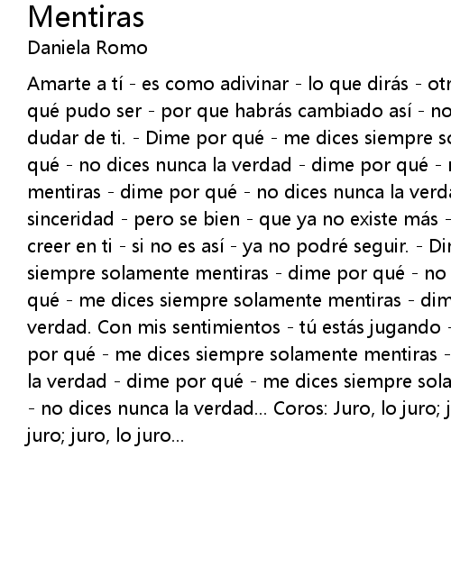 | Amarte a ti es como adivinar lo que dira s otra historia inventara s que pudo ser por que habra s cambiado asi no quiero ser quien tenga que dudar de ti. Dime por que me dices siempre solamente mentiras dime por que no dices nunca la verdad dime por que me dices siempre solamente mentiras dime por que no dices nunca la verdad. Me enamore de tu sinceridad pero se bien que ya no existe ma s hazme sentir que puedo creer en ti si no es asi ya no podre seguir. Dime por que me dices siempre solamente mentiras dime por que no dices nunca la verdad dime por que me dices siempre solamente mentiras dime por que no dices nunca la verdad. Con mis sentimientos tu esta s jugando asi no puedo seguir. Dime por que me dices siempre solamente mentiras dime por que no dices nunca la verdad dime por que me dices siempre solamente mentiras dime por que no dices nunca la verdad... Coros: Juro, lo juro juro, lo juro. Juro, lo juro juro, lo juro... |