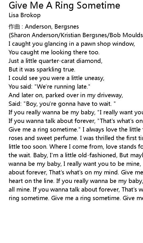 | Give me a ring sometime." I always love the little things you give me, Gentle roses and sweet perfume. I was thrilled the first time you kissed me. But just a little too soon. Where I come from, love stands for something. And it' s worth the wait. Baby, I' m a little oldfashioned, But maybe that' s okay. If you really wanna be my baby, I really want you to be mine, all mine. If you wanna talk about forever, That' s what' s on my mind. Give me a ring sometime. Don' t keep my heart on the line. If you really wanna be my baby, I really want you to be mine, all mine. If you wanna talk about forever, That' s what' s on my mind. Give me a ring sometime. Give me a ring sometime. Give me a ring sometime. |
