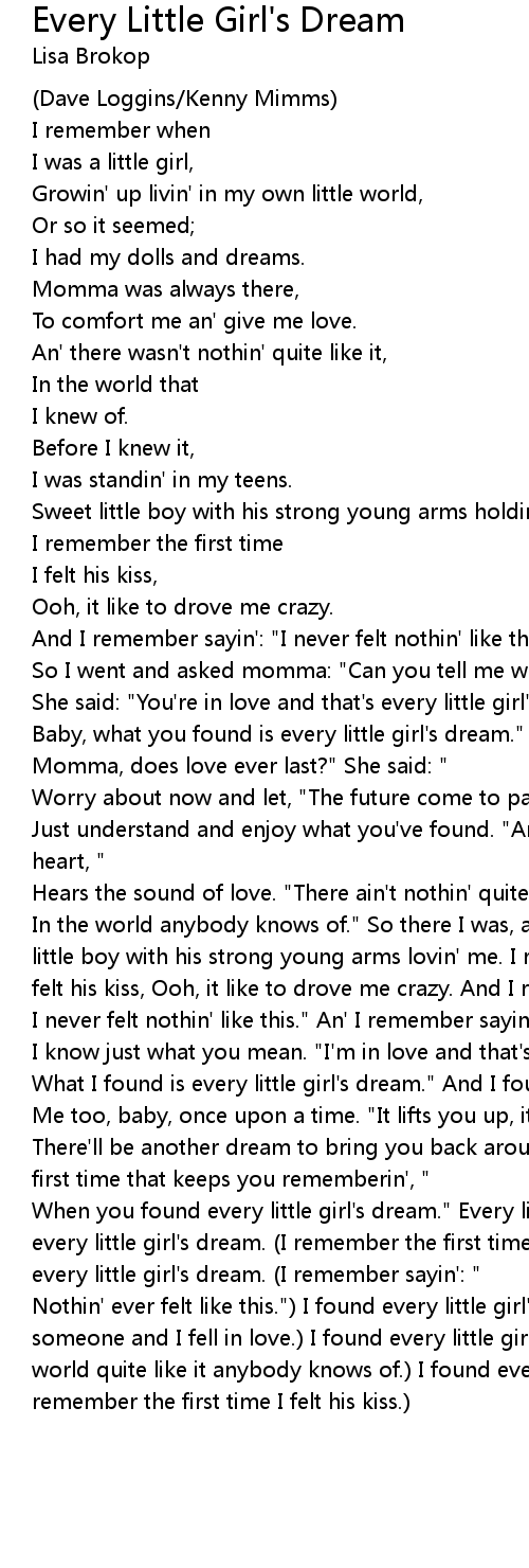 When you found every little girl's dream." Every little girl's dream. Found every little girl's dream. (I remember the first time I felt his kiss.) I found every little girl's dream. (I remember sayin': " |