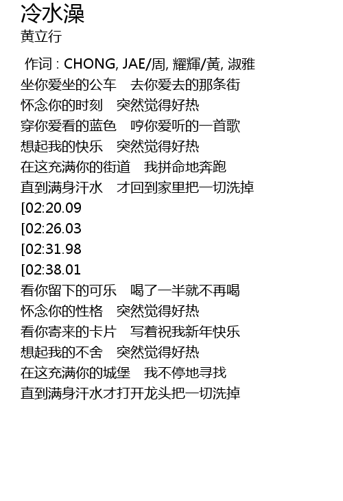 | [02:14.14] | zhí dào mǎn shēn hàn shuǐ cái dǎ kāi lóng tóu bǎ yī qiè xǐ diào |