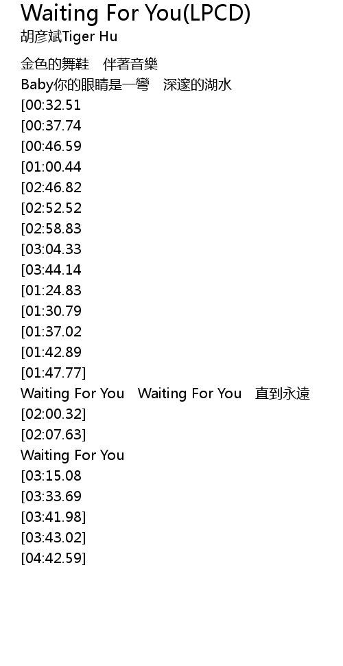 | [04:32.14][03:33.69] | Waiting For You Waiting For You Waiting For You |
