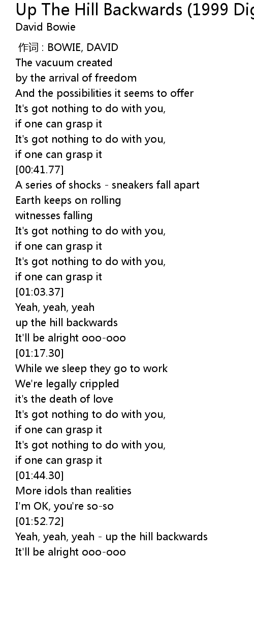 | [01:55.94] | Yeah, yeah, yeah - up the hill backwards |