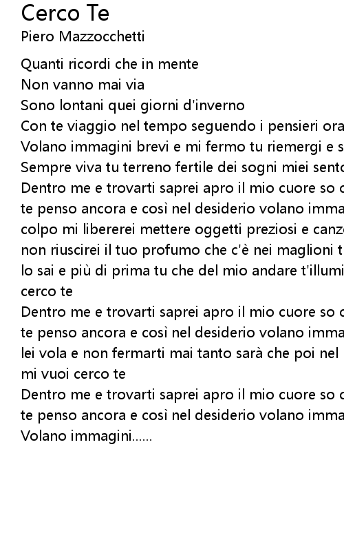 | Dentro me e trovarti saprei apro il mio cuore so che ci sei certo è che ora a te penso ancora e così nel desiderio volano immagini e intanto va pensiero da lei vola e non fermarti mai tanto sarà che poi nel ricordo di noi forse ancora mi vuoi cerco te | |