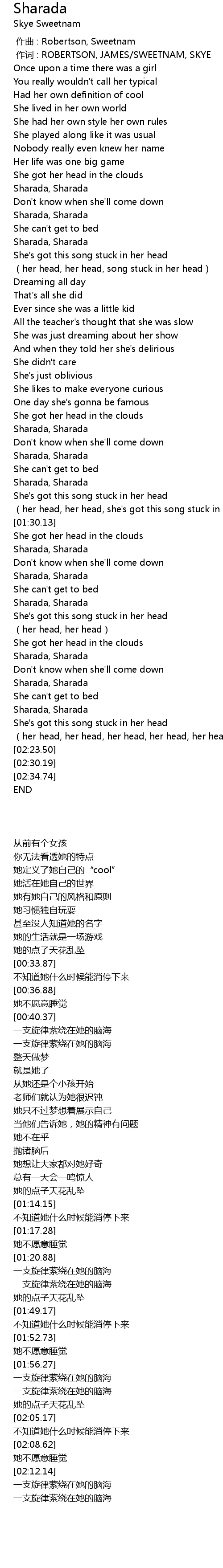 | [00:01.00] | 作词 : ROBERTSON, JAMES/SWEETNAM, SKYE |
