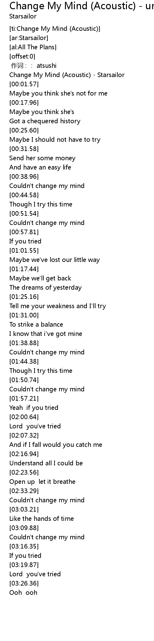 | [00:00.08] | Change My Mind Acoustic Starsailor |