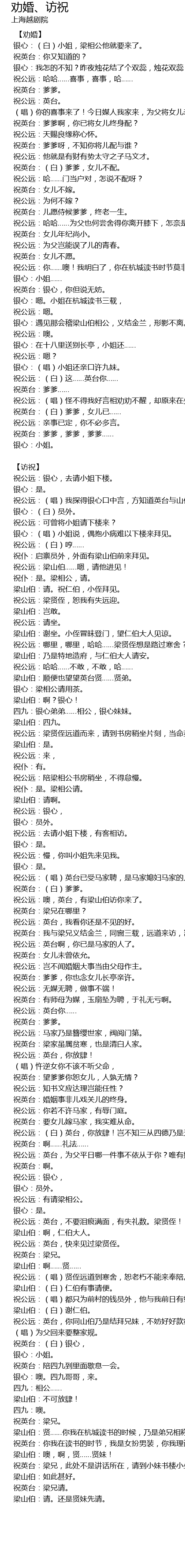 | (唱)你的喜事来了!今日媒人我家来,为父将女儿亲事配。如今攀得乘龙婿,我祝家门第多光彩。 | |