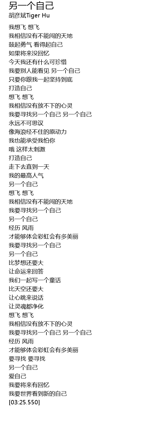 | [02:41.470] | wǒ yào xún zhǎo lìng yí gè zì jǐ lìng yí gè zì jǐ |