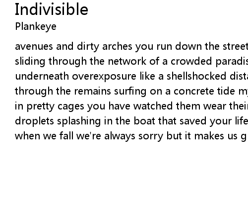 avenues and dirty arches you run down the street and i will follow try try sliding through the network of a crowded paradise my tears are indivisible underneath overexposure like a shellshocked distant past ride ride sifting through the remains surfing on a concrete tide my tears are indivisible animals in pretty cages you have watched them wear their ugliest faces cry cry saline droplets splashing in the boat that saved your life my tears are indivisible when we fall we're always sorry but it makes us glad to know it's only temporary |
