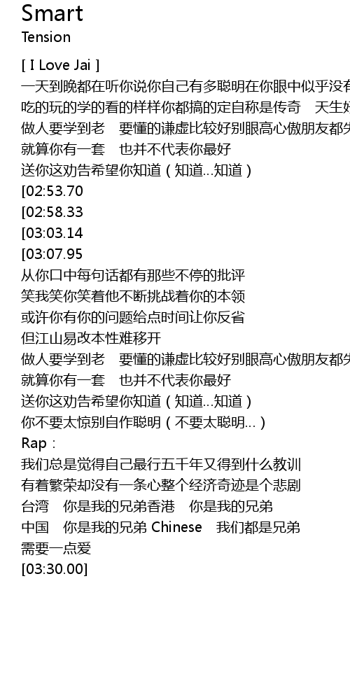 | [03:22.19][03:03.14][02:13.05][01:07.07] | 聪明 聪明不要一直觉得自己聪明 |