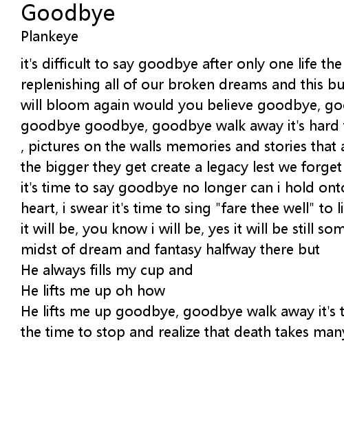 it's difficult to say goodbye after only one life the rain will fall down replenishing all of our broken dreams and this burning tree that's withering will bloom again would you believe goodbye, goodbye walk away it's time to say goodbye goodbye, goodbye walk away it's hard to say goodbye now all that's left , pictures on the walls memories and stories that are told the more often told the bigger they get create a legacy lest we forget goodbye, goodbye walk away it's time to say goodbye no longer can i hold onto this defeated change in heart, i swear it's time to sing "fare thee well" to life as we know it my voice it will be, you know i will be, yes it will be still something woke me up in the midst of dream and fantasy halfway there but |
