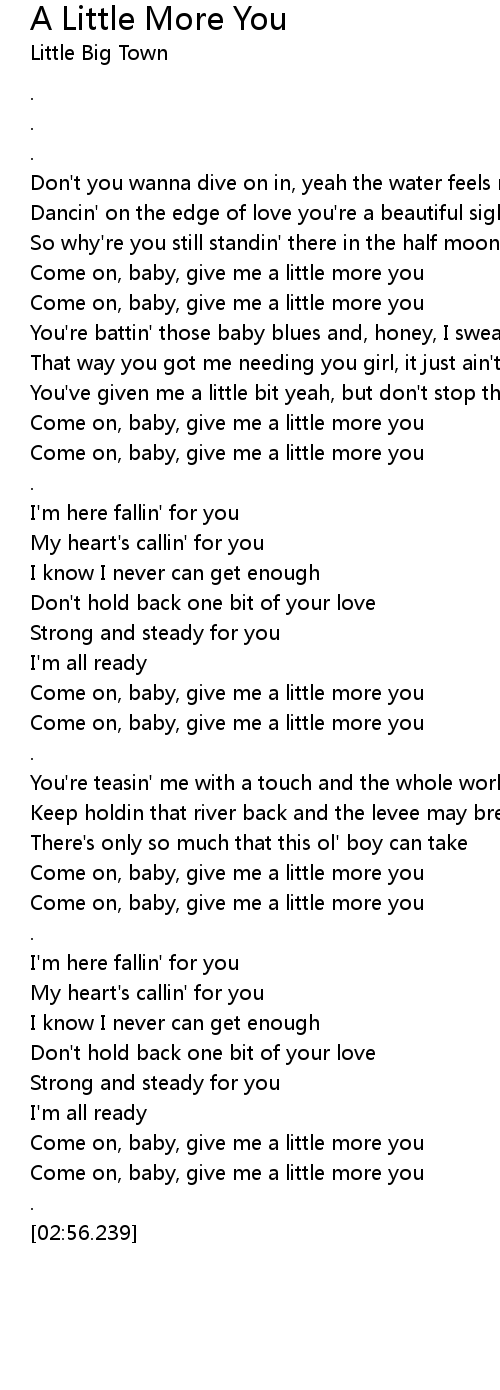 | [00:13.459] | Don't you wanna dive on in, yeah the water feels right |