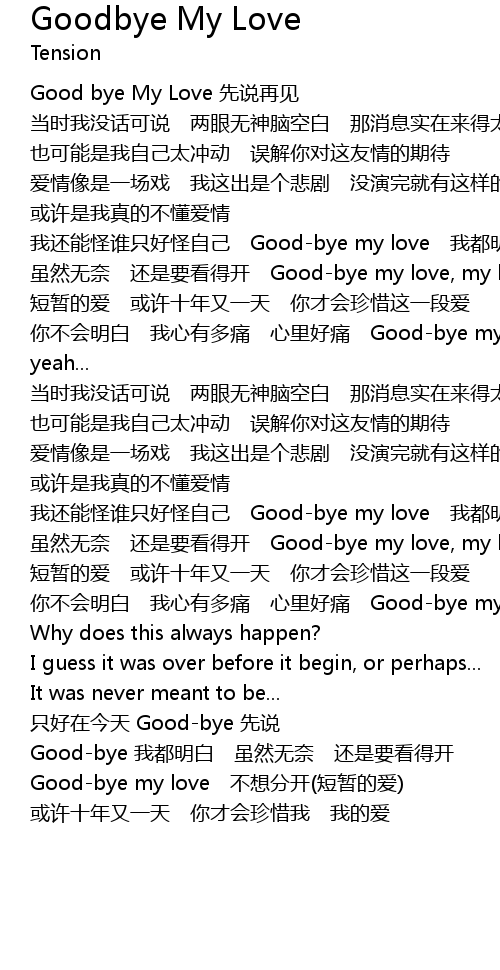 | [00:46.91] | wǒ hái néng guài shuí zhǐ hǎo guài zì jǐ Goodbye my love wǒ dōu míng bái |