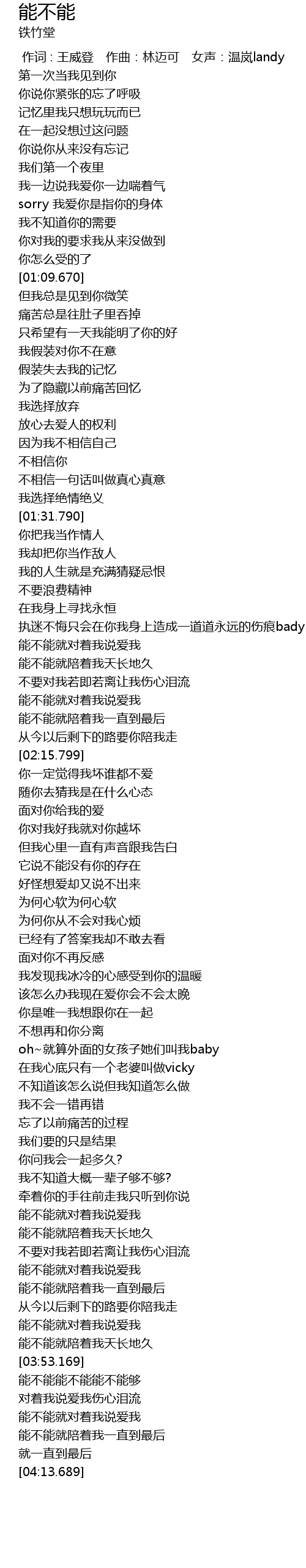 | [00:00.00] | 作词 : 王威登 作曲:林迈可 女声:温岚landy |