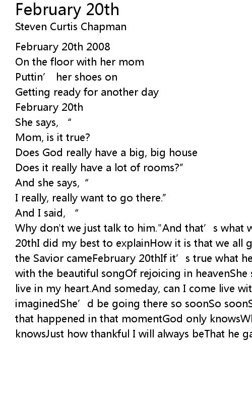 | Why don' t we just talk to him." And that' s what we didOn February 20thFebruary 20thI did my best to explainHow it is that we all go to be with GodHow it was the Savior cameFebruary 20thIf it' s true what he saidGod himself sang along with the beautiful songOf rejoicing in heavenShe said, " Jesus please come and live in my heart. And someday, can I come live with you?" We could never have imaginedShe' d be going there so soonSo soonSo soonGod only knowsEverything that happened in that momentGod only knowsWhat he whispered to her heartGod only knowsJust how thankful I will always beThat he gave her mom and meFebruary 20th |