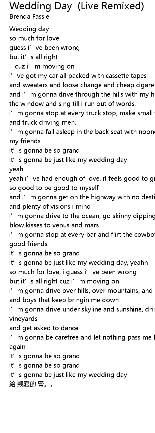 | [04:17.35] | it' s gonna be just like my wedding day |