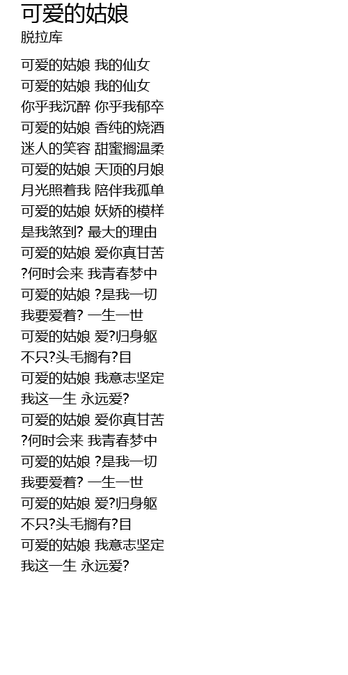 | [01:39.73] | 可爱的姑娘 爱你真甘苦 |