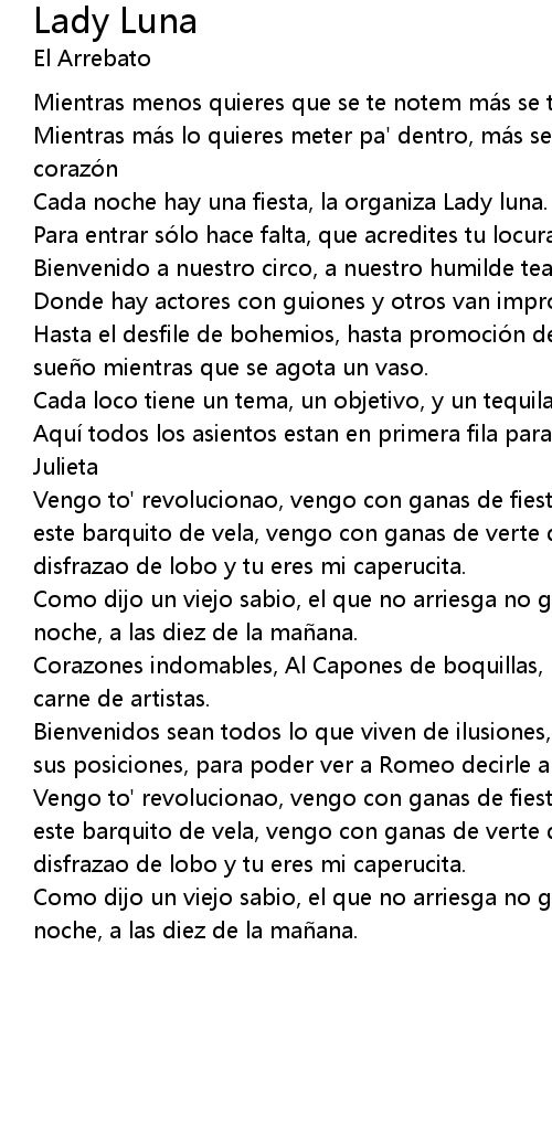 | Vengo to' revolucionao, vengo con ganas de fiesta, vengo echandole carbón a este barquito de vela, vengo con ganas de verte de comerte la boquita, vengo disfrazao de lobo y tu eres mi caperucita. | |