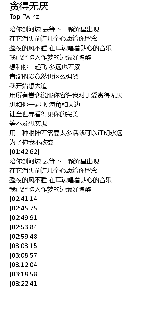 | [03:28.21][02:41.14] | 想和你一起飞 多远也不累 |