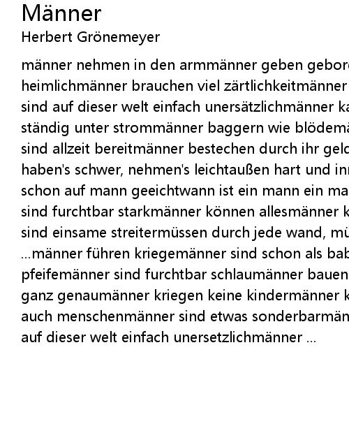 | männer nehmen in den armmänner geben geborgenheitmänner weinen heimlichmänner brauchen viel zärtlichkeitmänner sind so verletzlichmänner sind auf dieser welt einfach unersätzlichmänner kaufen frauenmänner stehn ständig unter strommänner baggern wie blödemänner lügen am telefonmänner sind allzeit bereitmänner bestechen durch ihr geld und ihre lässigkeitmänner haben's schwer, nehmen's leichtaußen hart und innen ganz weichwerden als kind schon auf mann geeichtwann ist ein mann ein mannmänner haben muskelnmänner sind furchtbar starkmänner können allesmänner kriegen 'n herzinfarktmänner sind einsame streitermüssen durch jede wand, müssen immer weitermänner ...männer führen kriegemänner sind schon als baby blaumänner rauchen pfeifemänner sind furchtbar schlaumänner bauen raketenmänner machen alles ganz genaumänner kriegen keine kindermänner kriegen dünnes haarmänner sind auch menschenmänner sind etwas sonderbarmänner sind so verletzlichmänner sind auf dieser welt einfach unersetzlichmänner ... |
