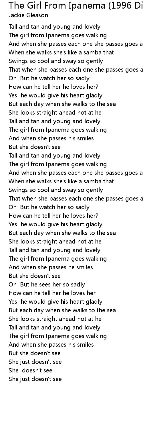 [01:07.22] The girl from Ipanema goes walking