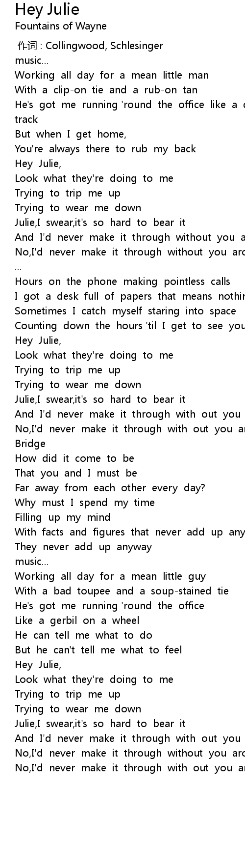 | [00:34.779] | Julie, I swear, it' s so hard to bear it |