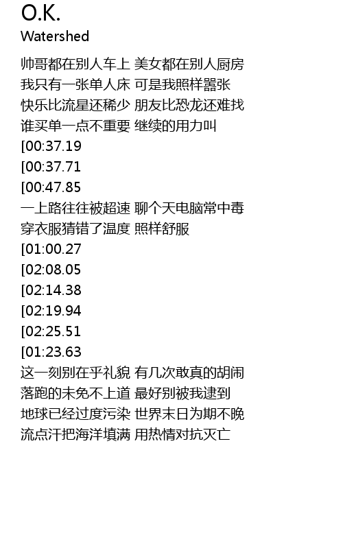 | [02:53.91][02:19.94][01:12.13] | OK bu xu yao he zui OK wu suo wei lang bei |
