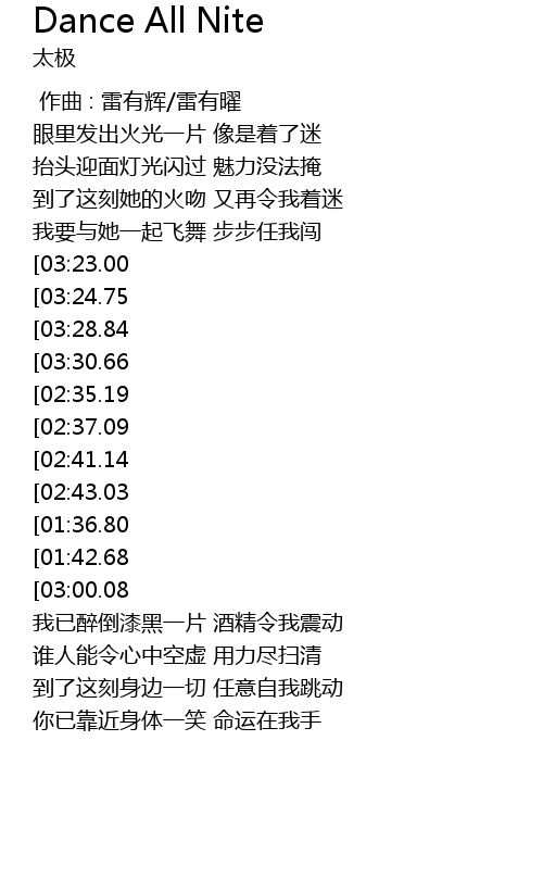 | [03:34.78][02:35.19][01:23.69] | Dancing all nite |