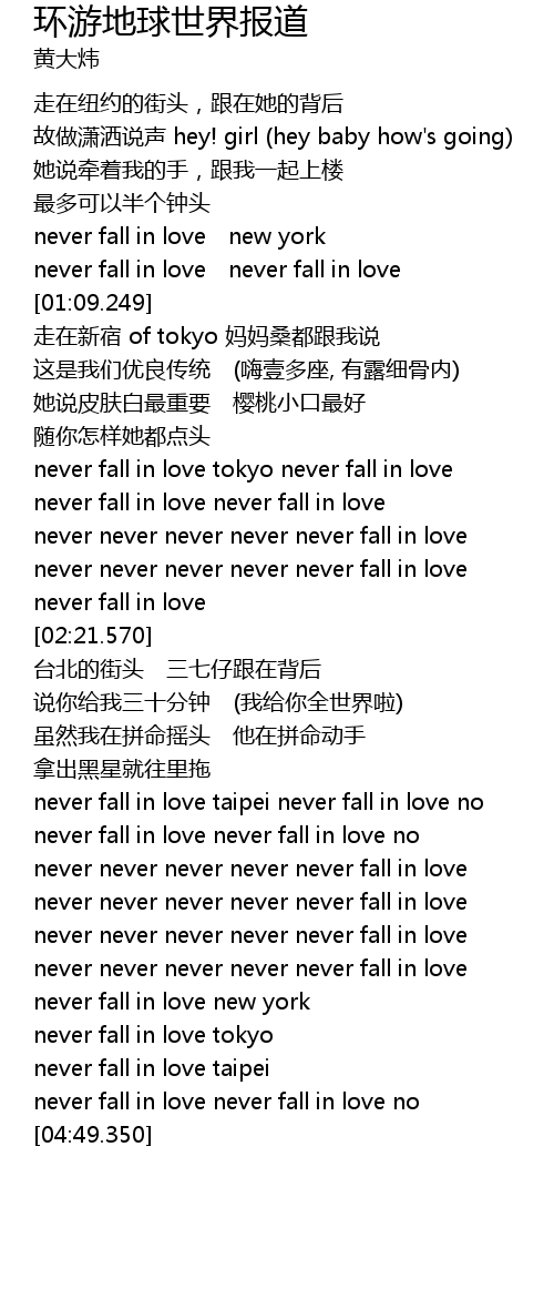 | [03:13.400] | never fall in love taipei never fall in love no |