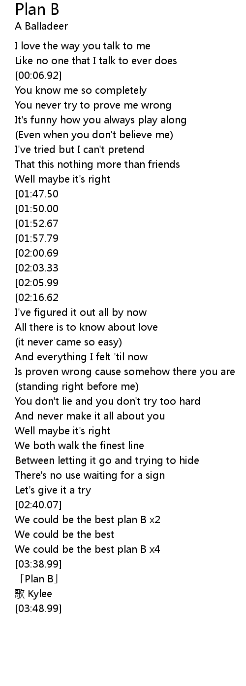 | [00:56.67][02:05.99] | We could be the best plan B x2 |