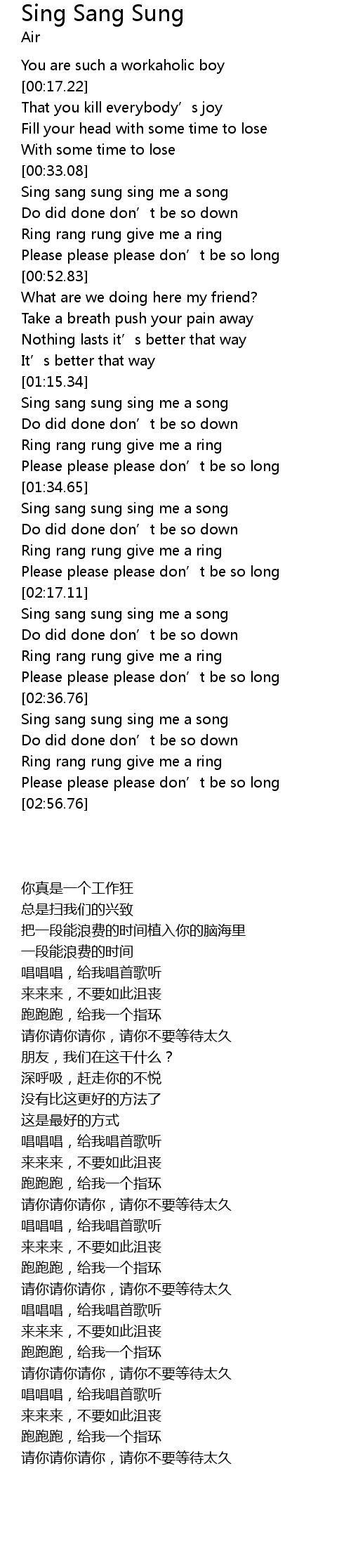 | [01:58.39] | Sing sang sung sing me a song |