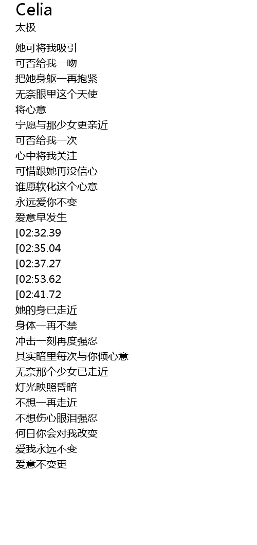 [03:01.17][02:53.62][02:39.96][01:52.64][01:46.37][01:01.02][00:54.47] CELIA