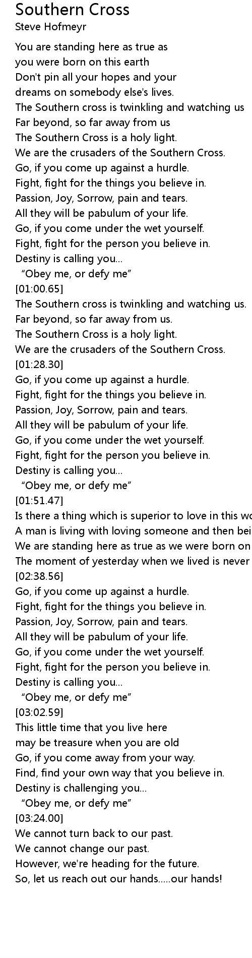 | [00:31.42] | The Southern Cross is a holy light. |
